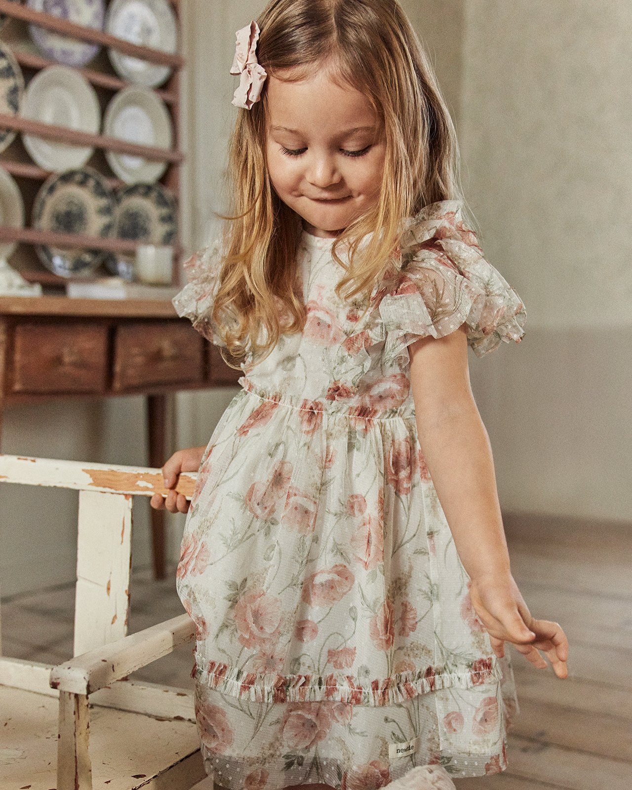 Kind in offweißem Blumen-Netzkleid mit Rüschenärmeln, braunen Schuhen und weißer Haarschleife. Dreiviertelbild.