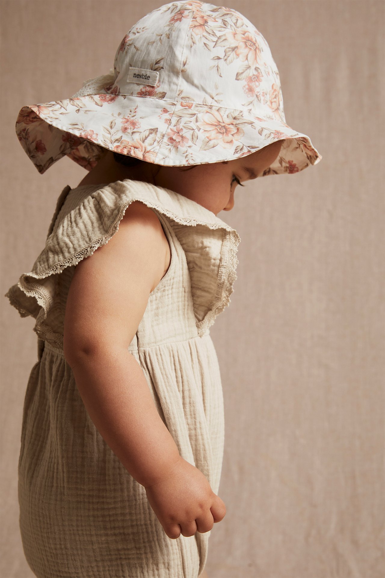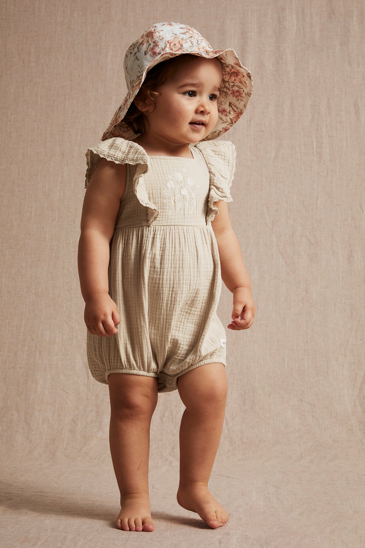Gewebter Spieler aus Baumwollkrepp mit einer Stickerei auf der Brust. Zarte Rüschen mit Spitzenrand an den Schultern sorgen für einen bezaubernden Blickfang. Der Spieler verfügt über eine Rückenöffnung mit Knöpfen, elastische Bündchen und Druckknöpfe im Schritt, die das An- und Ausziehen erleichtern.