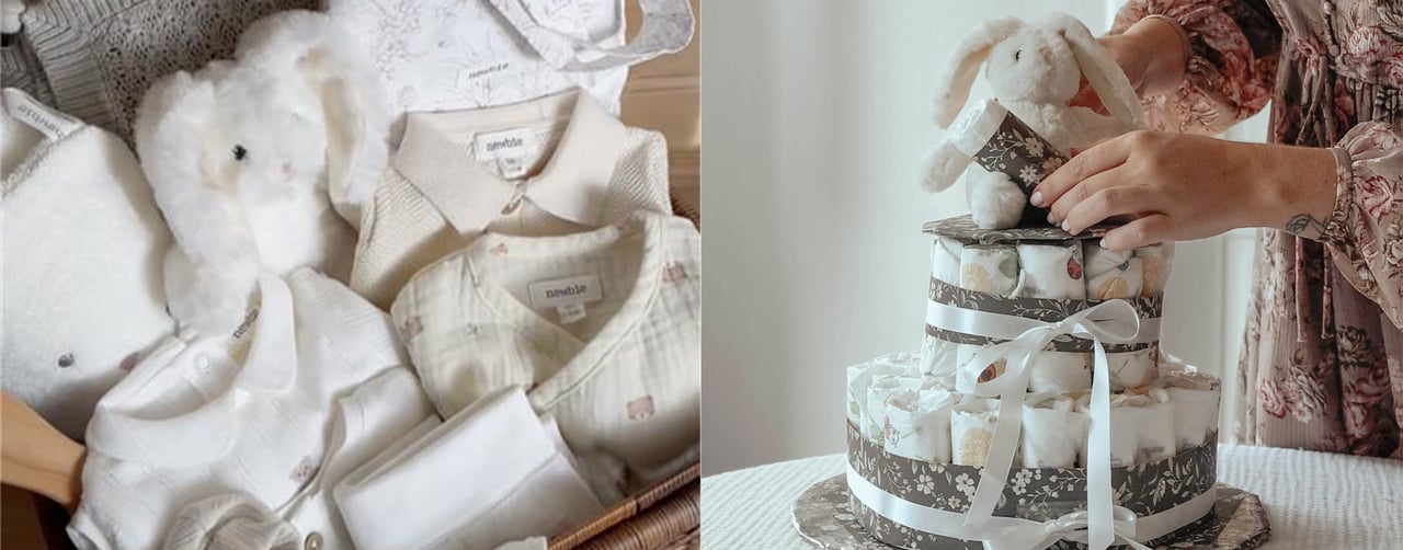 Draufsicht auf lächelndes Baby in off-weißem, geblümtem Langarm-Wickelbody, hält rosa Hasen-Schmusetuch.