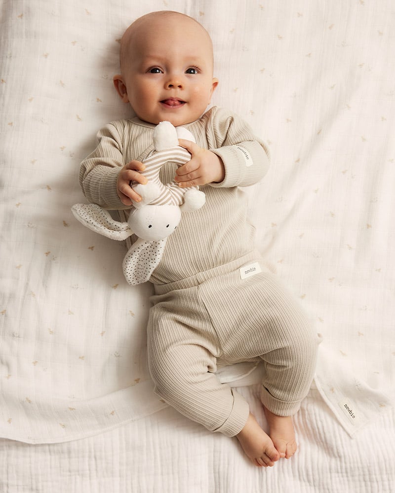 Ein weiches Stofftier wird zum ersten Freund des Babys. Unglaublich süß und liebevoll!