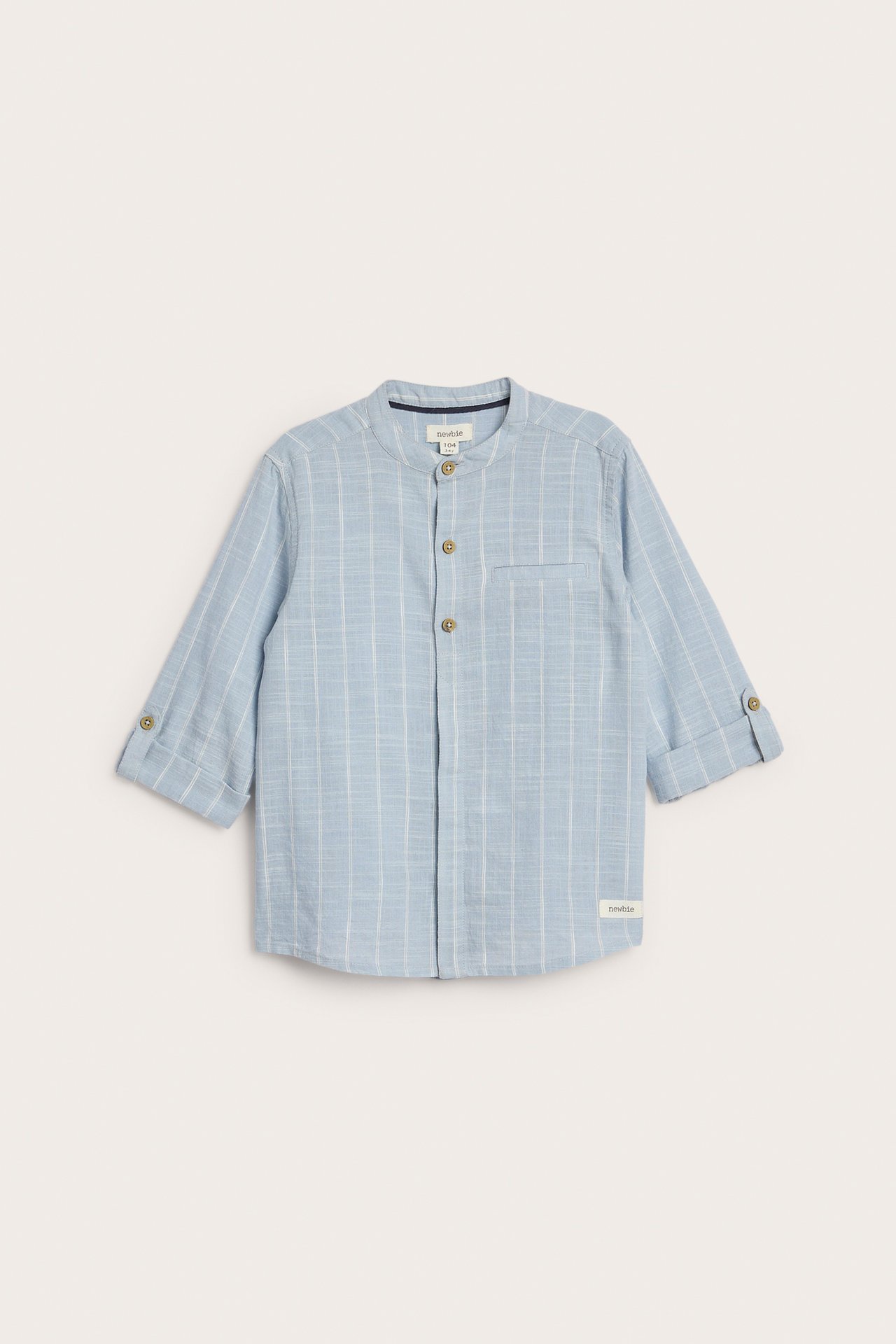 Gestreiftes Hemd mit Stehkragen von Newbie, hergestellt aus weicher Biobaumwolle. Praktischer Knopfverschluss auf der Vorderseite mit drei sichtbaren und ansonsten verdeckten Knöpfen. Eine dekorative Brusttasche. Bei Lieferung sind die Ärmel hochgekrempelt und mit Knopf und Lasche fixiert.