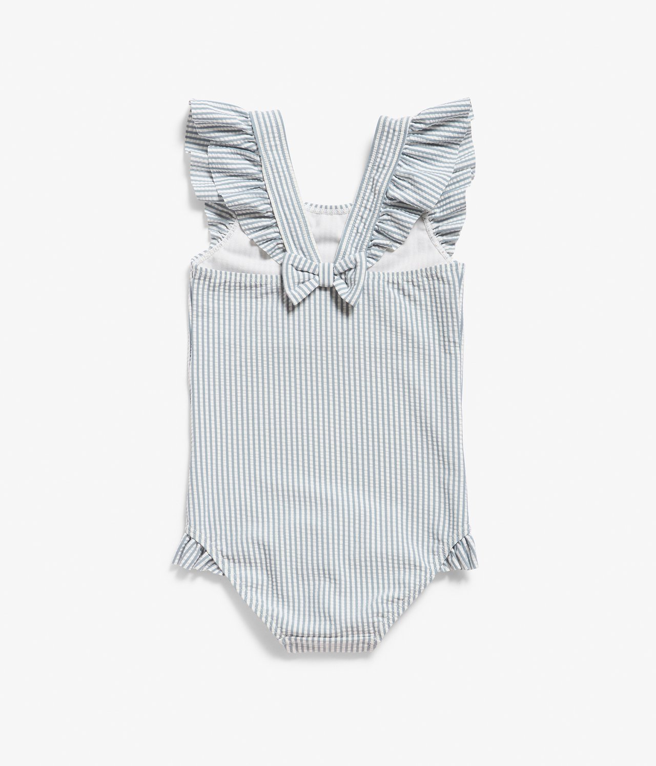 Gestreifter Badeanzug, sorgfältig gefertigt aus recyceltem Polyester. Dieses bezaubernde Design verfügt über Rüschendetails an den Schultern und Beinöffnungen sowie eine dekorative Schleife auf der Rückseite. Der Badeanzug ist an der Vorderseite und im Schritt vollständig gefüttert, um den perfekten Mix aus Style und Komfort zu bieten.