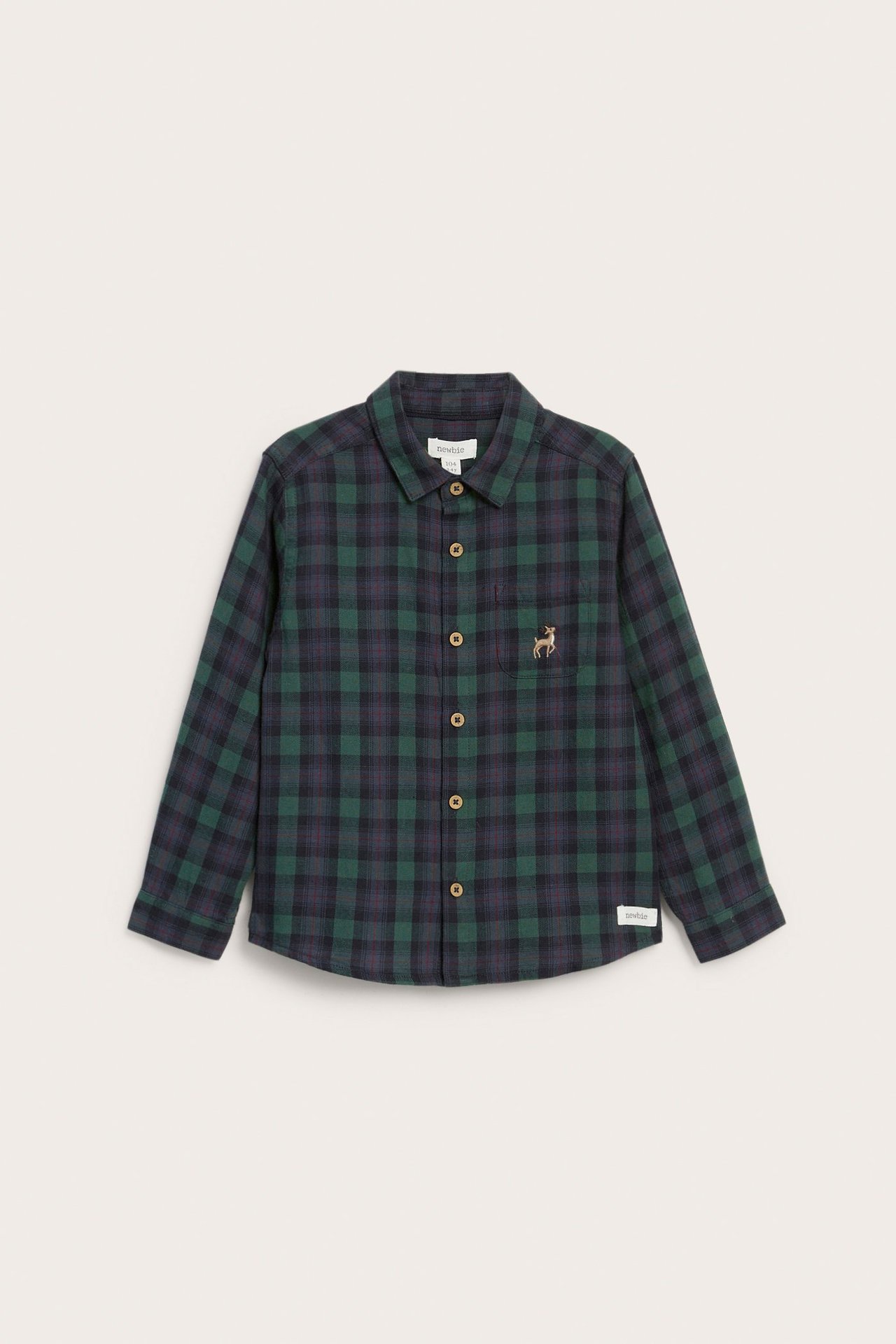 Kariertes Weihnachts-Hemd von Newbie aus weicher Biobaumwolle. Klassisches Hemd mit Kragen, Knopfverschluss vorne und Brusttasche mit Rentier-Stickerei. Manschetten mit Knopf an den Ärmeln und Rückenpasse, die für eine gute Passform sorgt.