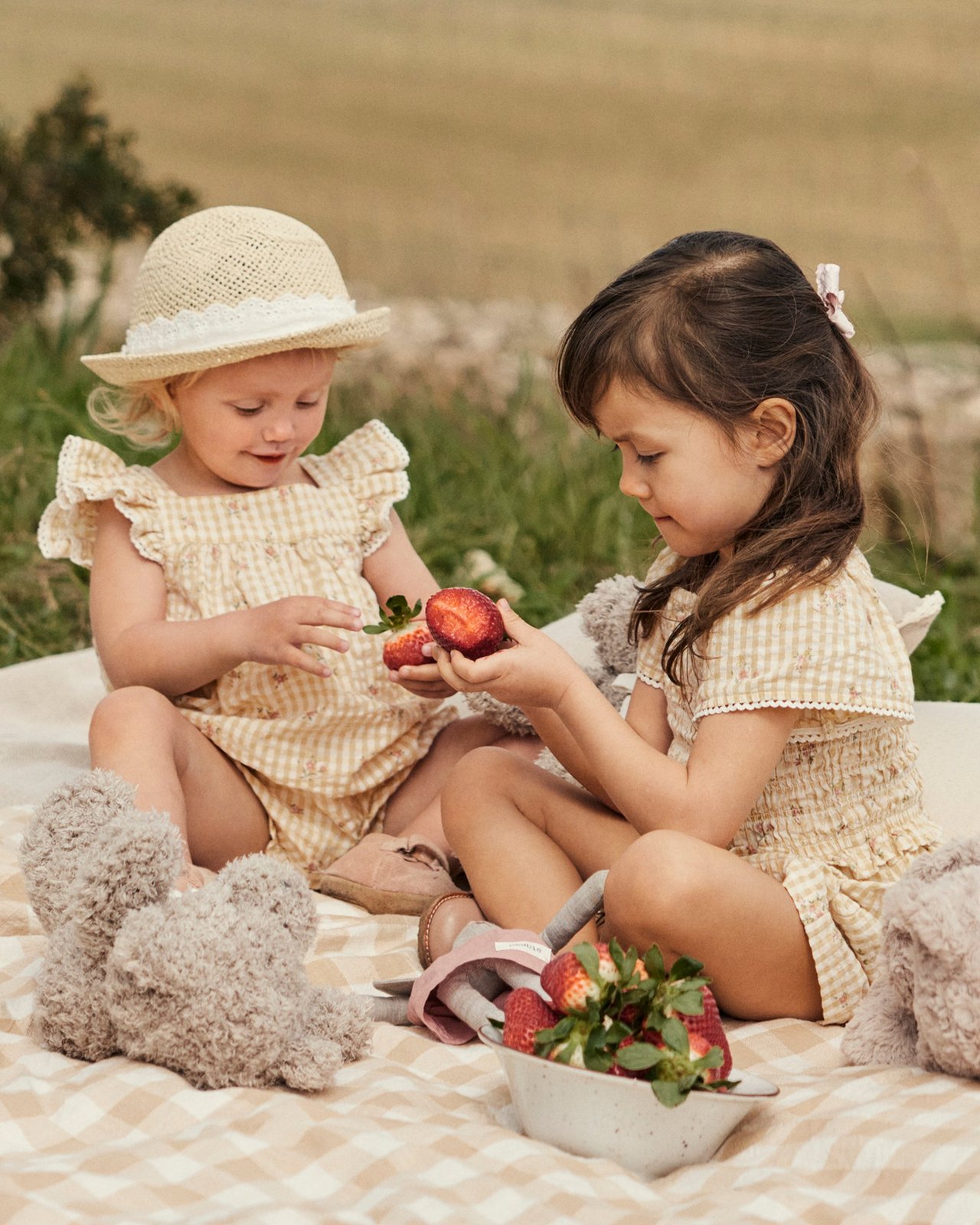 Begleiten Sie uns zu einem Picknick mit unserer bezaubernden Kollektion: Hier locken Erdbeer-Prints und niedliche Karo-Muster in zartem Rosa, Gelb und Grün. Verspielte Rüschen, Accessoires und passende Outfits für Groß und Klein sind perfekt, um an sonnigen Tagen unvergessliche Erinnerungen zu schaffen.
