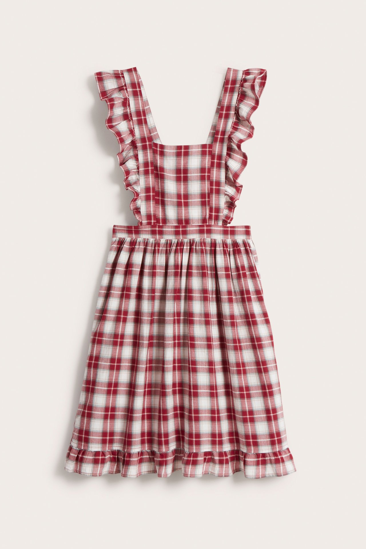 Karierte Schürze für Damen aus Rescued Fabrics. Aus angenehmer Bio-Baumwolle. Die Schürze wird hinten gebunden und hat schöne Rüschen an den Schultern und am Saum. Passende Varianten für Kinder erhältlich.