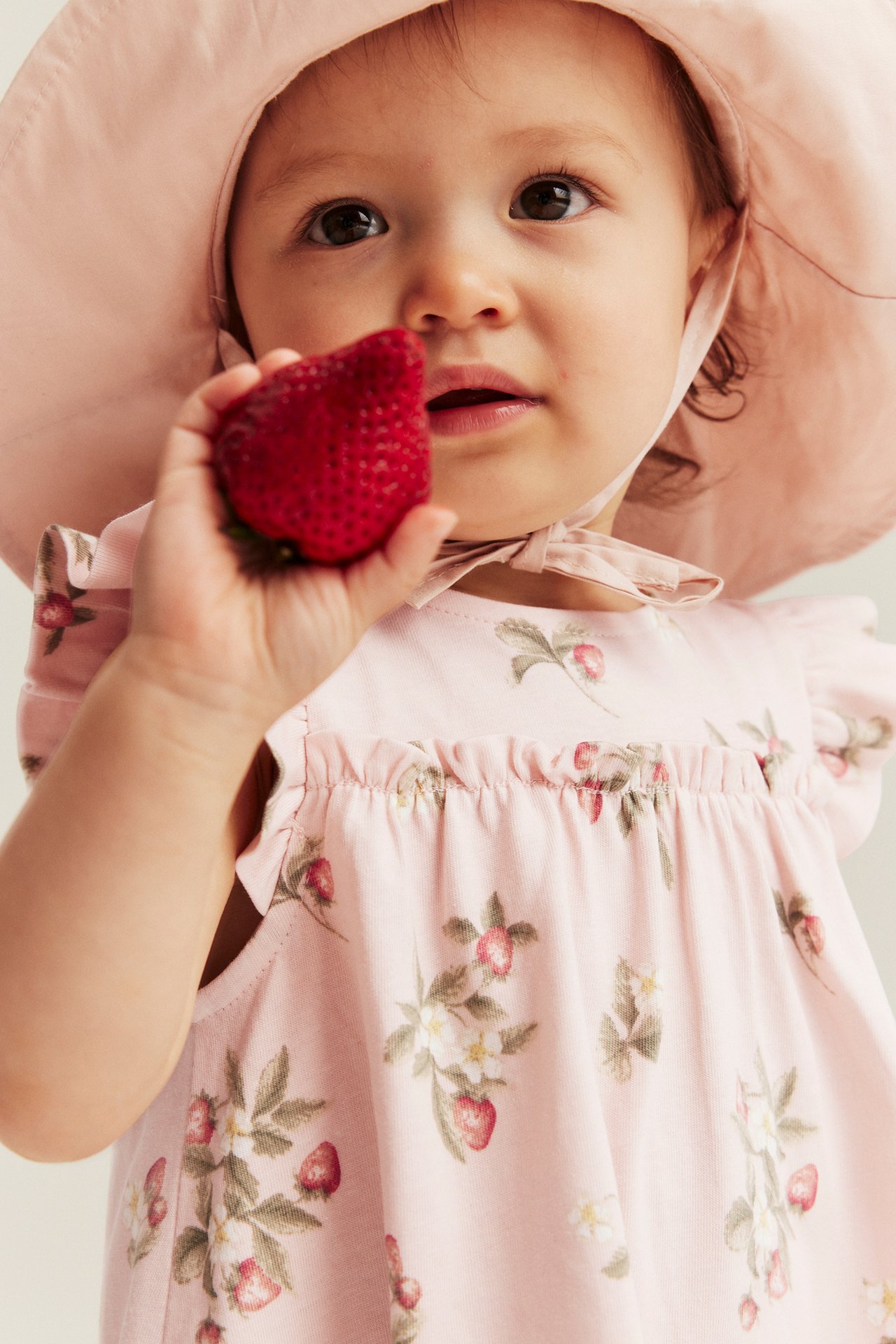 Close-up of a pink baby cotton jersey romper with deer and floral pattern, ruffles, and snap buttons.
