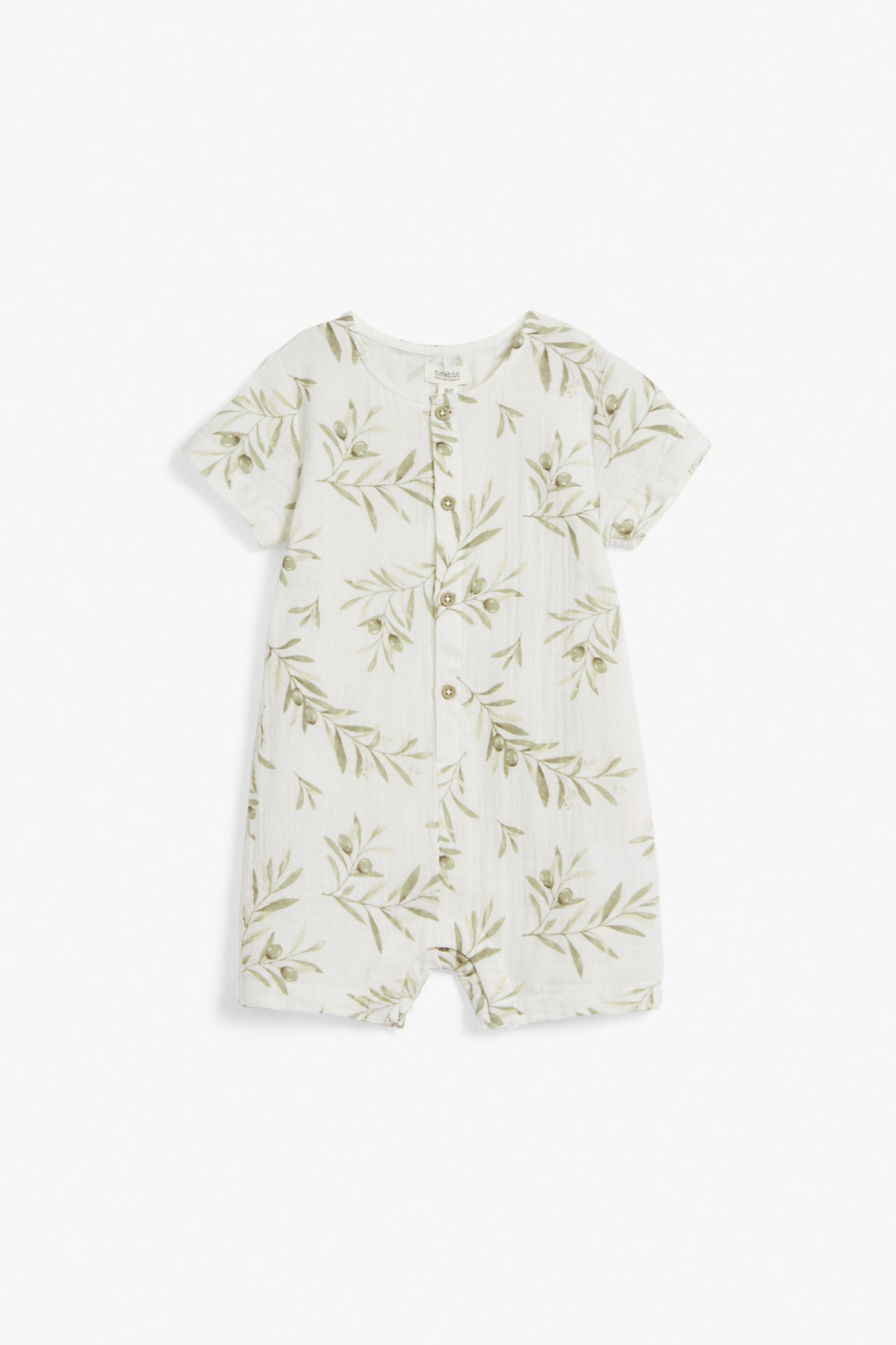 Woven jumpsuit from Newbie Rescued Fabrics – made from recycled materials. Front button closure and popper buttons at the gusset. Woven romper from Newbie Rescued Fabrics, crafted in organic cotton. Featuring front buttoning and press studs in the crotch, this adorable piece showcases a delightful leaf pattern. With short sleeves and legs, it's the perfect summer jumpsuit for your little one.