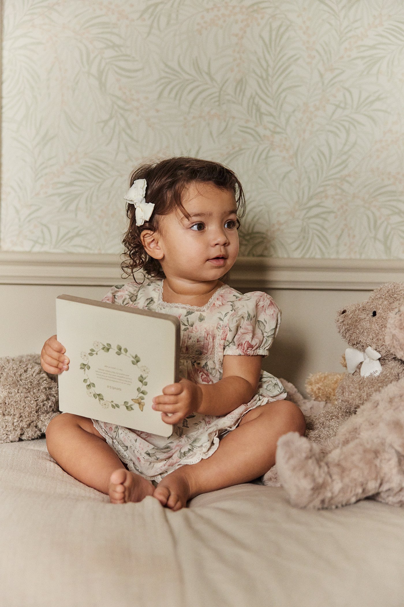 Side view of baby in off-white floral cotton dress with puff sleeves, lace trim, and a pink hair bow.