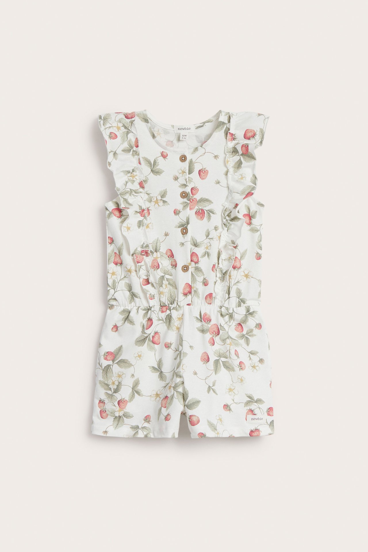 Adorable sleeveless jumpsuit from Newbie with strawberry print in soft jersey, in organic cotton. Designed with short legs, charming frills at the top and practical front closure with stylish buttons. Side pockets for both style and functionality. Mom and sibling sizes available.